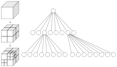 Зліва: рекурсивний поділ куба на октанти. Справа: відповідне дерево октантів.