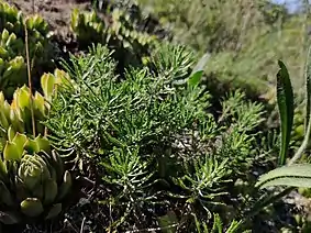 Багаторічна трав'яниста рослина від 10 до 50 см заввишки. Основи надземних пагонів дерев'яніють. Всі надземні пагони подовжені. Листки пірчасторозсічені або пірчастороздільні, з цільних лінійних сегментів, гребінчасто розташованих на широкому стрижні. Язички крайових квіток білувато-жовті, іноді майже білі[2].