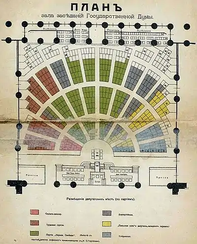 Перше засідання Державної думи відбулося 27 квітня 1906 року в Таврійському палаці Санкт-Петербурзі (після прийому у Миколи II у Зимовому палаці).