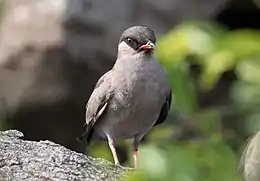 Птах завдовжки 17,5–19,5 см. Вага тіла 43–52 г. Верхня частина тіла сіро-коричнева. Через шию проходить біла лінія, яка закінчується біля очей. Крижі білі. Низ тулуба сірий, посередині черевця він стає білим. Нижня сторона крил темно-сіра з білою смужкою посереденя. Дзьоб чорний з яскраво-червоною основою. Ноги коралово-червоні.