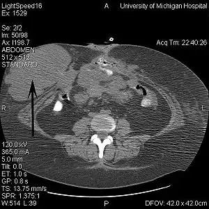 ![]() КТ-знімок органів черевної порожнини у пацієнта з синдромом Гарднера та місцево-розповсюдженим десмоїдом (стрілка). КТ-знімок органів черевної порожнини у пацієнта з синдромом Гарднера та місцево-розповсюдженим десмоїдом (стрілка). | |