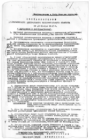 Постанова ВУЦВК від 21 листопада 1923 року про затвердження «Положення про десятихатників» 21.11.1923 р. (ДАЖО Р-28, оп. 6, спр. 38, арк. 51.)