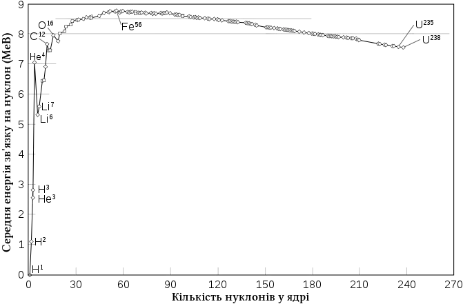 Дефект маси виникає внаслідок притягання між нуклонами у ядрі завдяки сильній взаємодії. Він найбільший для ядер у середині періодичної таблиці (як видно з наведеного рисунка) та зменшується при збільшенні атомного номера елемента. Завдяки цьому поділу важких елементів, наприклад, урану або плутонію, вивільняється енергія. З другого боку, як видно з рисунка, енергію можна отримати також при утворенні ядра гелію з ядер водню. Такий процес називається ядерним синтезом. Він є джерелом енергії зірок.
