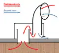 Схема будови суднового дефлектора. Потік повітря позначений червоним, води — блакитним.