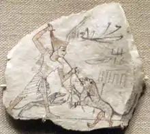 На остраконі періоду Рамессидів, фараон зображений в червоній короні