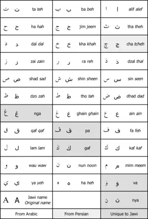 Абетка Джаві використовувалась протягом століть у малайському світі (Нусантара), а її розвиток пов'язують з прийняттям Ісламу. Складається Джаві головним чином з арабських букв та кількох додаткових символів, властивих тільки Джаві, на додачу.