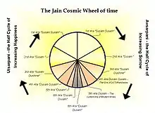 Джайни вірять, що Всесвіт ніколи не був створений і ніколи не припинить свого існування — він вічний. Хоча Всесвіт не має початку й кінця, але час циклічний. Кожен цикл (кальчакра) складається з двох напівциклів: напівциклу поступу (утсарпіні) та згасання (авсарпіні). Кожен із напівциклів ділиться на шість нерівних періодів (ара). Впродовж напівциклу розвитку людство розвивається від гіршого до кращого. На початку напівциклу мораль, щастя, сила, здоров'я, релігія в найгіршому стані. Досягнувши найкращого стану під кінець напівциклу, все починає регресувати. Джайни вірять, що наразі світ перебуває в п'ятій арі фази згасання, і до настання нової ари ще приблизно 19 тис. років. Шоста ара триватиме приблизно 21 тис. років. На початку нового напівциклу всі дерева бажань кальпавркса задовольнять усі прагнення людей. Люди тоді народжуватимуться парами близнюків — один хлопчик і одна дівчинка, залишаючись разом усе життя.