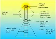 За уявленнями джайнів Всесвіт складається з неліченного числа джива (життєвих сил або душ). За своєю структурою він нагадує людину, яка стоїть, взявшись у боки. Вузький пояс містить у собі різні кшетри — місця, де бродять душі людей, тварин і рослин. Символічні груди Всесвіту є небесами (дева лока), притулком для душ богів. Нижче символічного поясу знаходиться пекло (нарка лока). Є сім різних нарка лока, в які може спуститися джива (душа), спокутуючи свої гріхи. Чим нижче — тим більше страждань і менше світла. На чолі символічного Всесвіту розташована сідха кшетра або мокша. Там у стані вічного миру та необмеженого щастя перебувать дживи, що досягли нірвани. За межами цієї символічної постаті немає нічого.