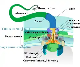 - Гачок — утворення, товстіше, ніж філамент (20-45 нм), складене з білка FlgE (можливо, також інших білків).