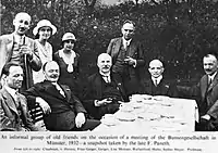 Перший ряд: Джеймс Чедвік, Ганс Гейгер, Ернест Резерфорд, Штефан Меєр і Карл Прибрам. Другий ряд: Дьєрдь де Гевеші, фрау Гейгер, Ліза Майтнер і Отто Ган (1932 рік).