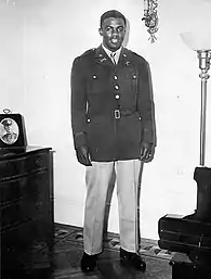 Після призову у 1942 році, Робінсона одразу ж направили до кавалерійського підрозділу військової бази Форт-Райлі, що знаходиться на північному сході штату Канзас. Маючи відповідну підготовку, Робінсон та ще декілька темношкірих солдатів, подали заяви на вступ до Навчальної військової частини з підготовки офіцерів, яка знаходилась при Форт-Райлі. І попри те, що починаючи з липня 1941 року чорношкірим солдатам дозволялось вступати до Навчальної військової частини[35], розгляд заяв Робінсона та його колег був відкладений на 7 місяців[36]. Завдяки допомозі чемпіона з боксу у суперважкій ваговій категорії Джо Луїса (який тоді служив у Форт-Райлі) та адвоката Трумена Ґібсона (який тоді обіймав посаду радника воєнного міністра)[37], хлопців врешті-решт прийняли до військової частини[31][36][38]. Після цього, Робінсон та Луїс стали друзями[39]. В січні 1943 року, пройшовши підготовку у частині, Робінсон отримав звання молодшого лейтенанта[40]. А вже трохи згодом, Робінсон та Айсум офіційно заручилися[36].