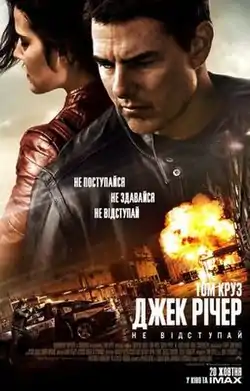 ![]() Постер до фільму "Джек Річер- Не відступай" на якому зображено Тома Круза в ролі Джека Річера Постер до фільму "Джек Річер- Не відступай" на якому зображено Тома Круза в ролі Джека Річера | |