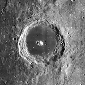 - Знімок західної частини кратера з роздільною здатністю 1,35 м/пікс (ширина — 3,3 км). LRO, 2009