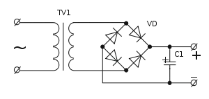Схема найпростішого трансформаторного джерела живлення.