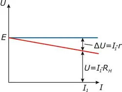 На графіку справа наведено навантажувальні характеристики ідеального джерела напруги (джерела ЕРС) (блакитна лінія) та реального джерела напруги (червона лінія).