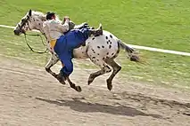 Похідний термін джигітування означає особливий стиль їзди вершника, який виник на Кавказі і в Центральній Азії, а також популярний у середовищі козаків, які перейняли його від народів Кавказу. При джигітуванні вершники на повному чвалі стоять, стрибають на землю й потім назад в сідло, підбирають предмети з землі (наприклад, монети, головні убори тощо), влучають в цілі різними видами зброї, їздять, висячи на боці коня або під його черевом, або можуть робити інші акробатичні вправи.