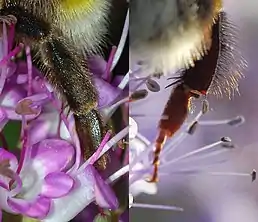 ![]() Ноги Bombus (Psithyrus) vestalis (ліворуч) та Bombus (Bombus s. str.) terrestris (праворуч) | ||||||||||||||||||||