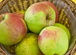 Плоди більші за середній розмір (8-9 см) і великі (170—220 г), одномірні, округлі, зеленувато-жовті, з оранжево-червоним розмито-смугастим досить яскравим рум'янцем на 2/3 поверхні. Шкірочка середньої товщини, щільна, еластична, гладенька, блискуча. М'якуш жовтий, щільний, соковитий, відмінного, дуже гармонійного кисло-солодкого смаку (4,6 бала).