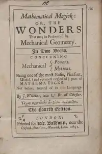 У 1648 році виходить у світ «Математична магія» (англ. Mathematical Magick) Вілкінса з присвятою його підопічному принцу Карлу Людвігу. Книга складалася з двох частин; перша частина, під назвою «Архімед», була присвячена опису традиційних механічних пристроїв, таких як важіль, ваги, блок а друга, більш белетризована — «Дедал» — складнішим пристроїв і механічним машинам. У «Дедалі» автор розповідає, зокрема, що англійський чернець Ейлмер у XI столітті, користуючись механічними крилами, здійснив політ з дзвіниці собору. У подальших прикладах і міркуваннях про «летючих людей» Вілкінс описує якусь «летючу колісницю» — конструкцію, яка доволі нагадує сучасний аероплан. Вілкінс посилається при цьому на праці як стародавніх вчених, так і своїх сучасників, таких як Гвідобальдо дель Монте і Марен Мерсенн[27], а також згадує книгу Годвіна «Людина на Місяці», герой якої використовував птахів для польоту на Місяць[28].