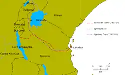 У 1856 році Спік і Бертон організували нову експедицію, але вже в Східну Африку з метою відкриття Великих озер, які, за чутками, перебували в центрі континенту. Мандрівники також не втрачали надії знайти джерело Нілу, яке, ймовірно, знаходився в озері Малаві (або озері Ньяса)[5]. Експедиція була дуже складною. Її учасники страждали від тропічних захворювань. А Спік навіть тимчасово оглух, коли в його вухо потрапив жук (його вдалося витягнути тільки за допомогою ножа), а згодом — тимчасово осліп. Експедиції вдалося в лютому 1858 року відкрити озеро Танганьїка, помилково прийняте Бертоном за витік Нілу[6].