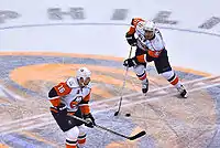 Джон Сім (ліворуч) разом з Франсом Нільсеном розпочинають атаку «Нью-Йорк Айлендерс».