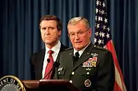 Джон Шалікашвілі (праворуч) з міністром оборони Вільямом Коеном (ліворуч) під час брифінгу в Пентагоні