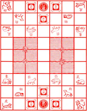На дошці є кілька спеціальних областей та полів: Притулок' (獸穴 shòuxuè шоусюе, 'звірине лігво') знаходиться в центрі першого ряду дошки та позначено китайським ієрогліфом.Пастки (陷阱 xiànjǐng сяньцзін, 'вовча яма; пастка, капкан') знаходяться праворуч та ліворуч від Притулку, а також перед ним, і теж позначені відповідним китайським ієрогліфом. Дві області з водою або Річки (河川 héchuān Хечуань) знаходяться в центрі дошки. кожна Річка має розмір 2x3 поля, і підписана китайським символом, що позначає річку. Протилежні сторони ігрового поля з'єднуються трьома колонками звичайних «сухопутних» клітин — дві з них по краях дошки, одна — посередині між «річками».