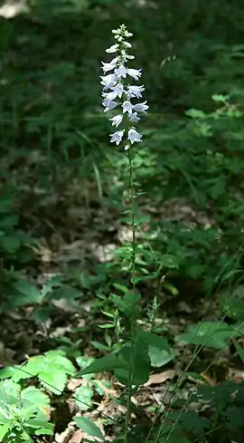 Багаторічна трав'яниста рослина 35–60 см заввишки. Стебло і листки знизу сірувато-густо-волосисті. Стебло вгорі 3-гранне. Листки нерівно-городчато-зубчасті нижні — серцеподібно-довгасті, на довгих черешках, розташовані вище — серцеподібно-яйцеподібні, напівстеблообгортні. Квітки на коротких ніжках, в довгому китицеподібному суцвітті. Віночок блакитний або ліловий, 10–18 мм завдовжки, на краях голий[2]
