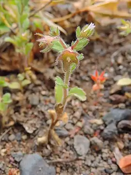 Однорічна трав'яниста рослина. Часто має розгалужене стебло висотою від 3 до 10 (30) см. Стебла сланкі або висхідні. Листки лопатчаті, оберненояйцевидні або довгасті, тупо-зубчасті. Прикореневі листки 1 см завширшки й 3–4 см завдовжки; листки стеблові 1 см завдовжки. Квітковий віночок світло-блакитний, від 2 до 5 міліметрів. Капсули 3–3.8 мм в діаметрі. Насіння 0.5–0.6x0.2 мм. Період цвітіння триває з березня по травень