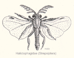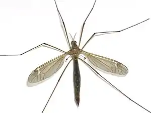 | Добре помітні дзижчальця позаду пари крил у комара-довгонога | Дзижчальця перед парою крил у віялокрилого |