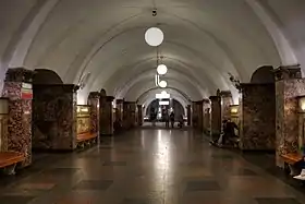 Нави станції відокремлені один від одного, і головного об'ємно-просторового значення набуває центральний зал. Склепіння трьох залів станції спираються на потужні кубічні пілони з гладкими стінами в проходах і двома виступами в поздовжніх стінах залів. Пілони оздоблені уральським мармуром «Тагіл», що відрізняється різноманітністю малюнка, фактури і великою кількістю відтінків — від густо-червоного до перлинно-сірого. Виступи пілонів завершують декоративні капітелі. На ці капітелі спираються стрілчасті розпалубки навів. Піднімаючись вгору, розпалубки перетинаються посередині склепіння. У цих точках перетину підвішені скляні кульові люстри в бронзовій оправі.
