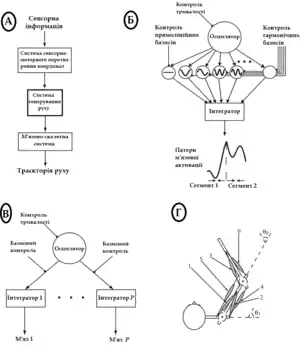 Етапи генерування сегменту руху динамічною моделлю: 1) сенсорна інформація репрезентується як статичні вхідні сигнали; 2) ці сигнали відображаються системою сенсорно-моторного перетворення координат (ССМП) в статичні моторні команди, які репрезентують заплановані рухи; 3) статичні моторні команди подаються на систему генерування руху (СГР), чиї вихідні сигнали генерують часові патерни м'язової активації і 4) м’язи приводять до руху м'язово-скелетну систему, яка є динамічною системою другого порядку, тому вихідні сигнали із СГР визначають миттєве прискорення.
