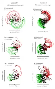 де проявляє значний обертальний компонент. Ключовою рисою цієї моделі було те, що динаміка є однією й тією ж самою серед всіх умов виконання руху. Тому кожна умова є різною нейронною траєкторією в одному й тому ж просторі динамічних станів.