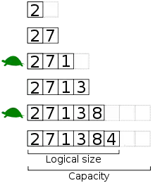 У випадку збільшення логічного розміру, може виникнути необхідність збільшення розміру масиву. При видаленні елементу, необхідно наступним до видаленого елементам присвоїти значення наступного, тобто зсунути елементи масиву вліво. При додаванні, щоб запобігти засміченню пам'яті при зміні розміру масиву багаторазово, його об'єм збільшують вдвічі з метою використання резервного простору для майбутніх операцій. Додавання пам'яті можна реалізувати наступним чином: