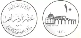 10 дирхамів, 1436 (2014 н.е.) року, Ag Харакатеристика монети: Вага: 20 гр. Діаметр 38 мм. Товща: 2,4 мм. Гурт: рифленний. Тираж: невідомий Опис монети: аверс: Емітент, маса монети, проба металу, номінал надписом Реверс: Мечеть Аль-Акса, номінал цифрою, рік карбування примітки: Модел'єр невідомий. Підпільний монетний двір в Газіантепі