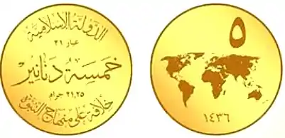 5 динарів, 1436 (2014 н.е) року, Au Харакатеристика монети: Вага: 21,25 гр. Діаметр 29 мм. Товща: 2,30 гр. Гурт: рифленний. Тираж: невідомий Опис монети: аверс: Емітент, маса монети, проба металу, номінал надписом реверс: мапа Світу, номінал цифрою, рік за Гіджрою примітки: Модел'єр невідомий. Підпільний монетний двір в Газіантепі