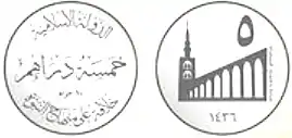 5 дирхамів, 1436 (2014 н.е.) року, Ag Харакатеристика монети: Вага: 10 гр. Діаметр 26 мм. Товща: 2,3 мм. Гурт: рифленний. Тираж: невідомий Опис монети: аверс: Емітент, маса монети, проба металу, номінал надписом Реверс: Дамаський білий маяк, номінал цифрою, рік карбування примітки: Модел'єр невідомий. Підпільний монетний двір в Газіантепі
