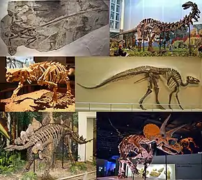 | Реконсторукції скелетів: Microraptor gui, Apatosaurus louisae, Pinacosaurus grangeri, Edmontosaurus regalis, Stegosaurus stenops, Triceratops horridus | |