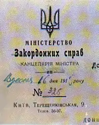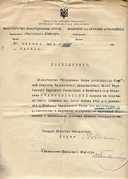 Посвідчення Станіслава Старосольського - старшого секретаря Дипломатичної Місії Української Народної Республіки в Швейцарії. 1919 рік.