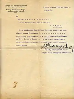 Лист Станіслава Старосольського - старшого секретаря Дипломатичної Місії Української Народної Республіки в Швейцарії до посла УНР в Швейцарії Миколи Василька, 25 вересня 1919 року.