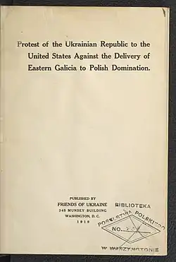 Протест Української Республіки до США проти здачі Східної Галичини польському пануванню. Юліан Бачинський - дипломатичний представник Української Народної Республіки у Вашингтоні. 1919 рік.