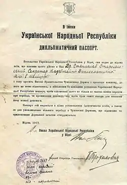 Дипломатичний паспорт Станіслава Старосольського - старшого секретаря Дипломатичної Місії Української Народної Республіки в Швейцарії. 1919 рік.