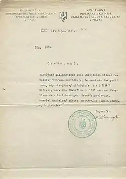 Посвідчення видане українському громадянину Дипломатичною місією Української Народної Республіки у Празі, 11 жовтня 1921 року.