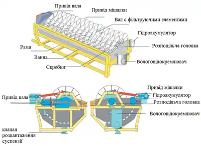 Пластина фільтра складається з макропористої основи з каналами для дренажу фільтрату і мікропористої мембрани з обох сторін. Товщина пластини 24-30 мм. Всередині пластини передбачена порожнина для збору і відводу фільтрату, який видаляється по патрубку через втулку. Пластини за допомогою втулки кріпляться на валу і пов'язані з вакуумною системою, що складається з трубопроводу фільтрату, розподільного клапана, системи збору фільтрату і вакуум-насоса. Фільтрувальні диски занурені в пульпу, яку закачують у ванну через шланговий затвор. Для підтримки пульпи у завислому стані є мішалка.