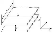 На рисунку показано частину поверхні модельного хвилеводу, який використаємо для ілюстрації особливостей поширення акустичних хвиль. Такий модельний хвилевід утворено двома нескінченними жорсткими пластинками. Відстань між пластинками позначено як . Розглянемо поширення гармонічного збурення, характеристики якого не змінюються по координаті . Вважаємо, що збурення поширюється в напрямку координати . Враховуючи, що потенціал звукового поля має задовольняти двовимірне хвильове рівняння та граничні умови на жорстких поверхнях , Потенціал звукового поля у хвилеводі набуває вигляду[5]:. Тут прийнято позначення: .