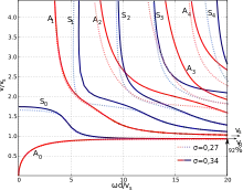 Хоча дисперсійні рівняння для пружних хвиль у двовимірному випадку одержані Лембом на початку 20 століття їх ґрунтовний аналіз проведено лише в роботах Р. Міндліна (Raymond D. Mindlin)[8]. Міндліном вказано ефективний метод аналізу дисперсійних рівнянь та пошуку всіх (дійсних, уявних та комплексних) коренів. Дійсні корені визначають дисперсійні властивості хвиль, що поширюються у хвилеводі. На рисунку представлено дані про фазові швидкості симетричних (сині криві)та антисиметричних (червоні криві) хвиль для двох матеріалів з різними значеннями коефіцієнта Пуасона. У випадку пружного хвилеводу в ньому можуть поширюватися хвилі, як з нормальною, так і з аномальною дисперсією.