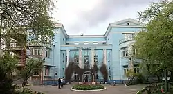 Оригінальний текст (рос.) Излишняя, может быть, классичность фасадов искупается мастерством выполнения и пониманием темы. Четырехколонный портик легок, ажурен и хорошо запоминается. |