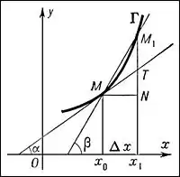 До виразу типу (2) зводиться задача побудови дотичної до площини кривої у деякій точці . Нехай крива Г є графіком функції . Положення дотичної можна знайти якщо знати її кутовий коефіцієнт, тобто тангенс кута , який дотична утворює з додатнім напрямом осі .