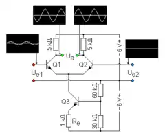 Резистор Re виконує роль стабілізатора струму (в більш складних схемах замість нього встановлюють електронний стабілізатор струму). Струм, який протікає через цей резистор, поділяється між двома гілками - на транзисторі Q1 та Q2 відповідно. Диференціальний вхідний сигнал на вході призводить до перерозподілу струму між транзисторами Q1 та Q2, в результаті на виході формується вихідний сигнал, пропорційний диференційному вхідному.