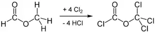 Також застосовується метод синтезу із фосгену: при дії на нього метанолу утворюється естер, який у подальшому хлорують: